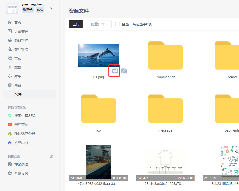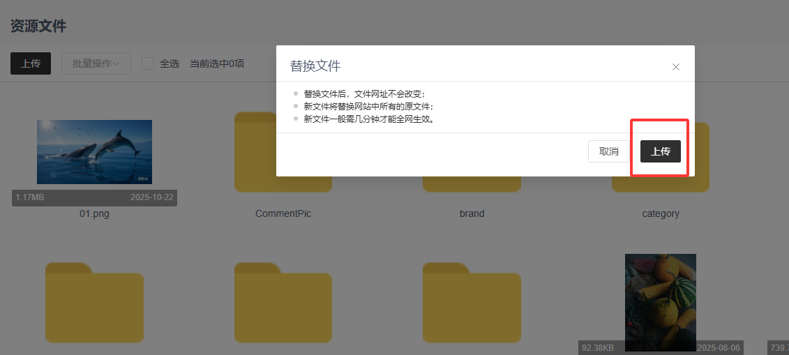 选择需要替换的资源 — 点击替换图标 — 点击上传 — 选择本地资源文件 — 点击“打开”。