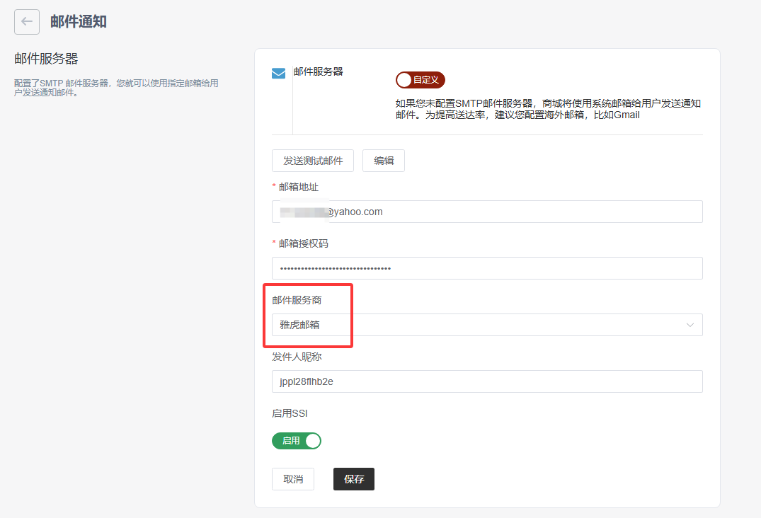 商城后台的设置,请选择Yahoo邮箱,填写邮箱帐号、授权码,开启SSL,点击保存即可。