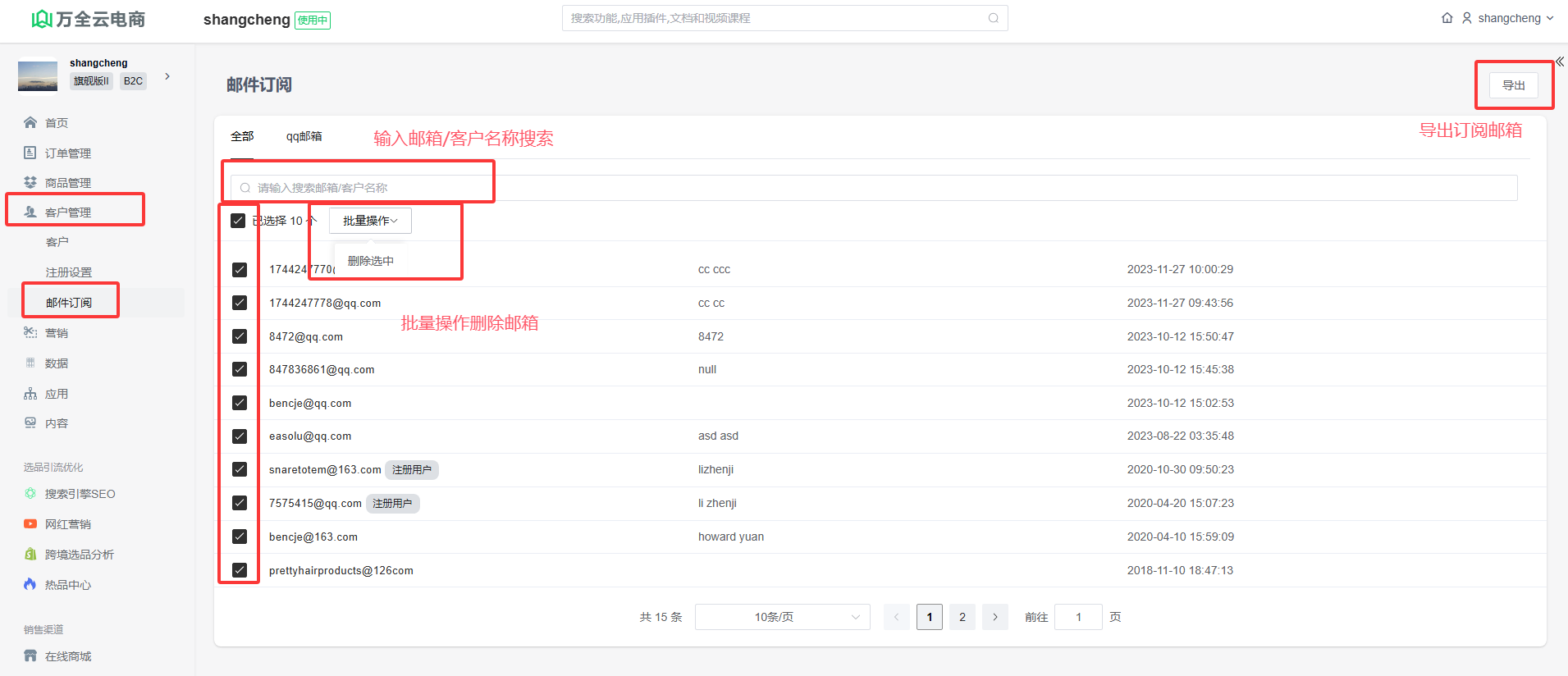 登录网站后台,点击“客户管理”—“邮件订阅”,可查询、删除及根据条件导出邮件。