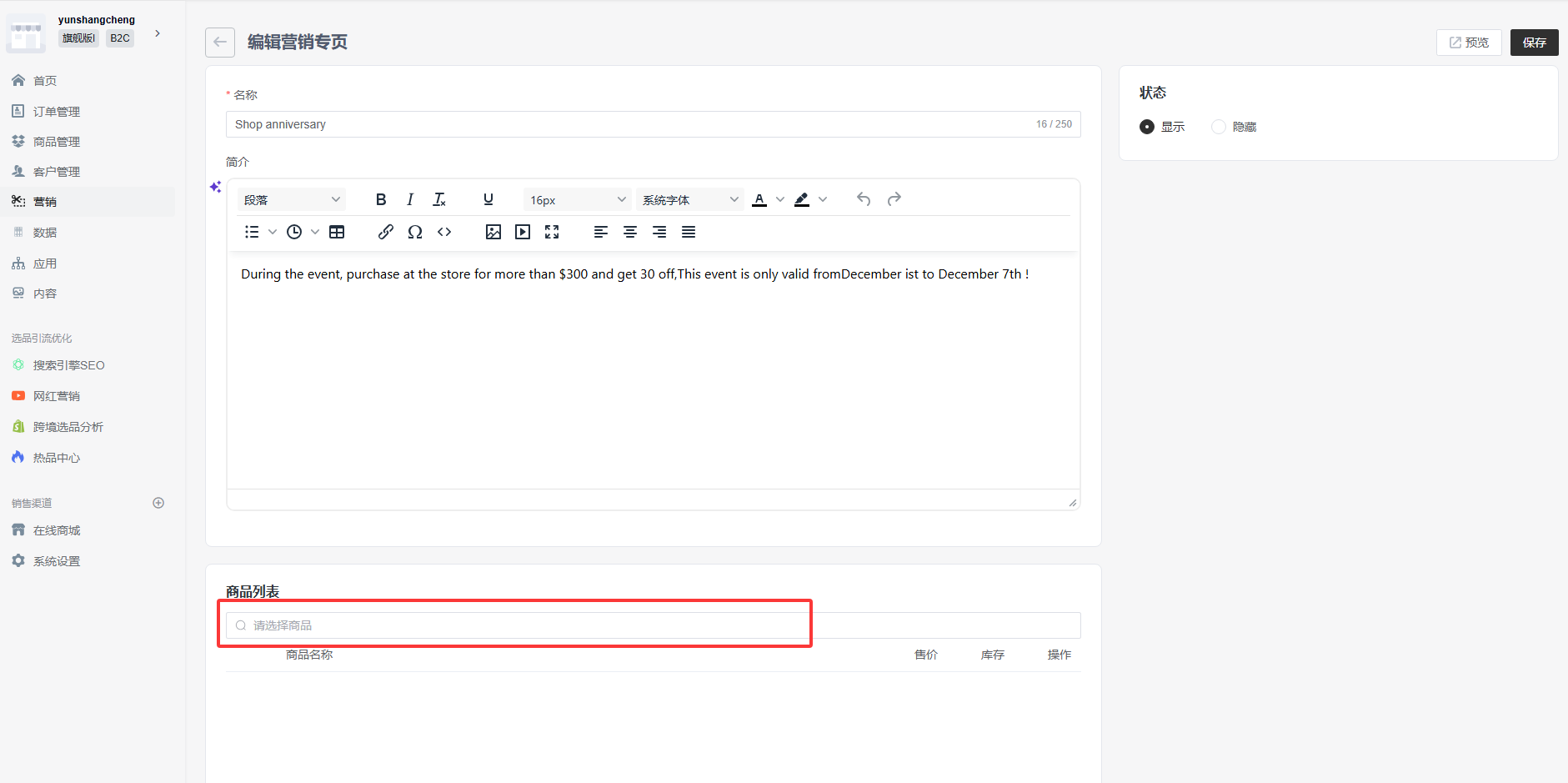 点击请选择商品输入关键词搜索,在搜索的结果列表勾选所需商品;