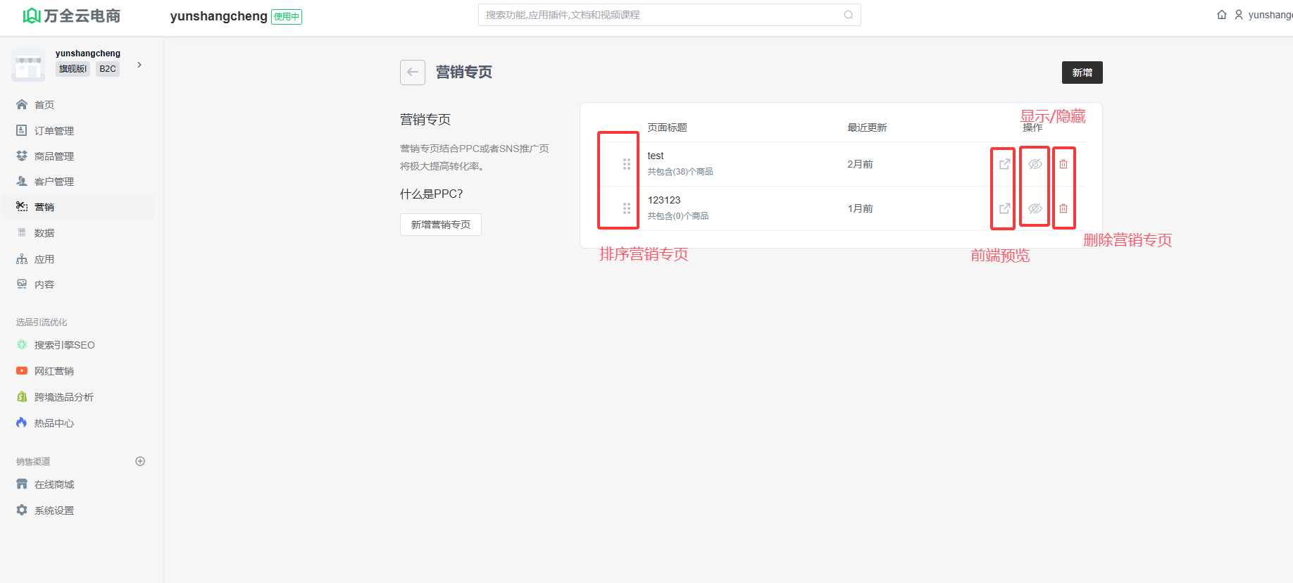 在营销专页列表页面可以进行排序、预览、显示/隐藏、删除营销专页