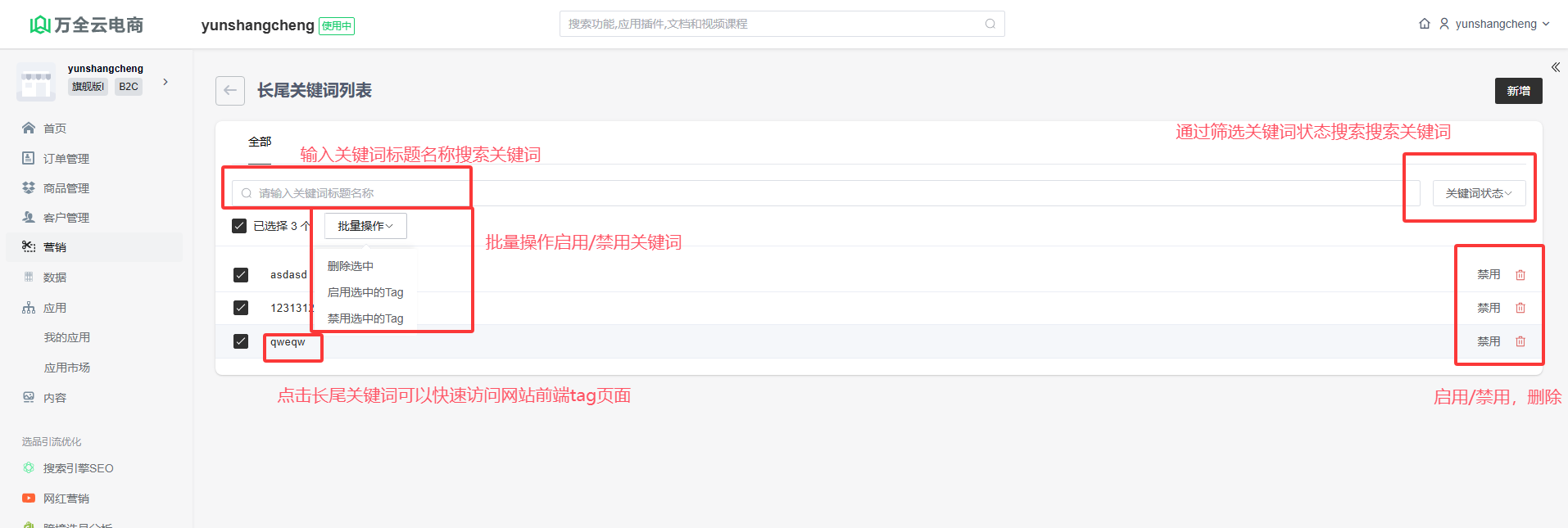 查找:通过长尾关键词的状态或名称来搜索长尾关键词;