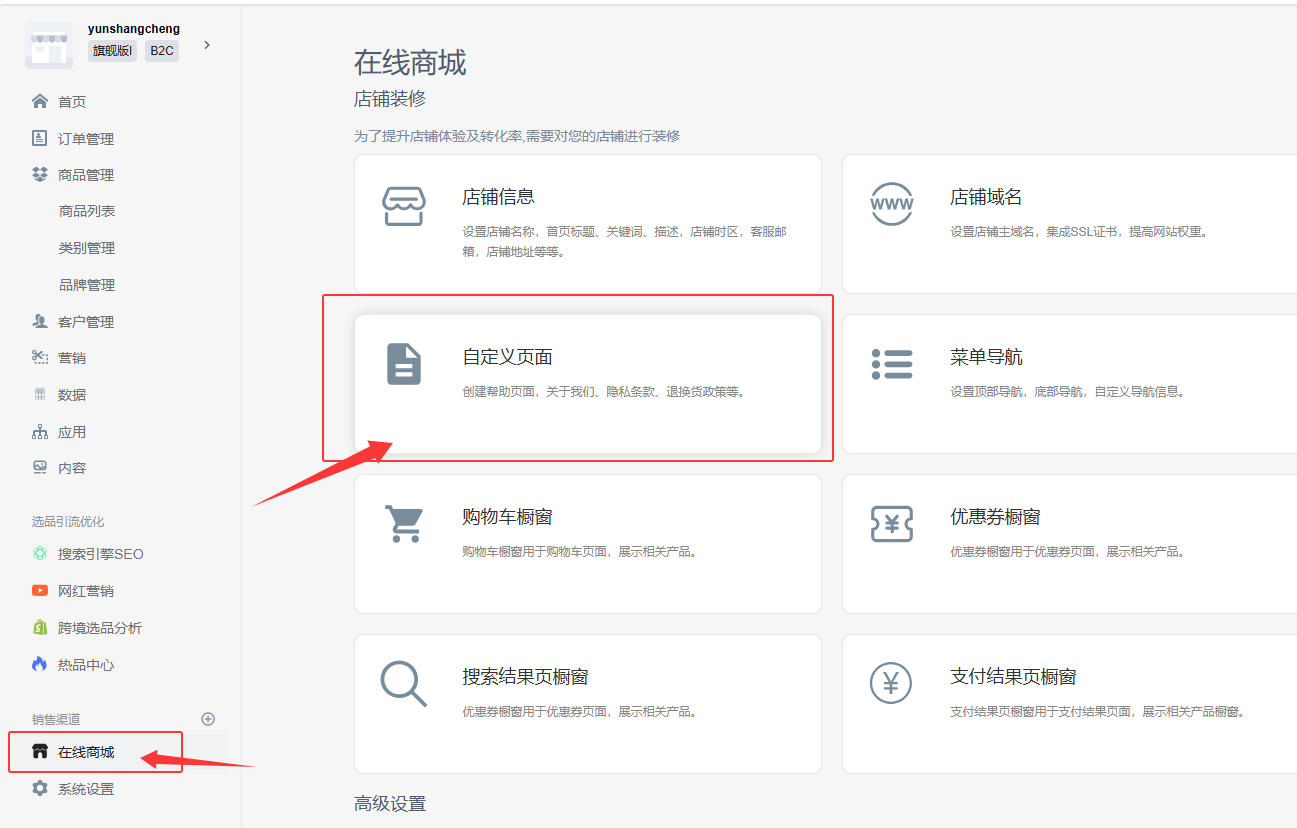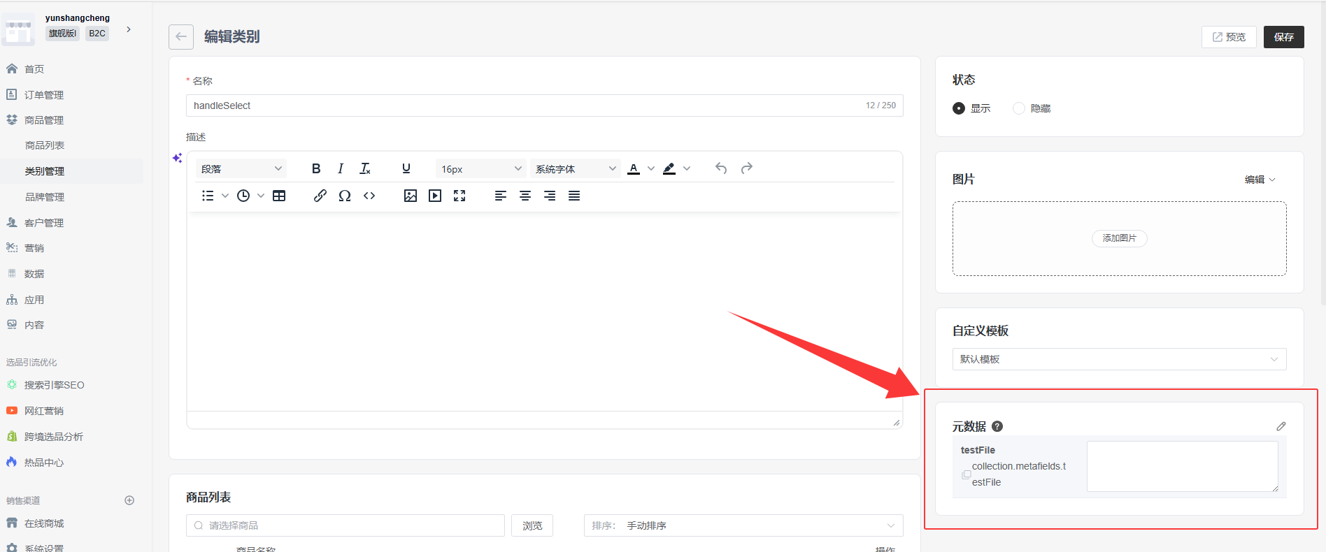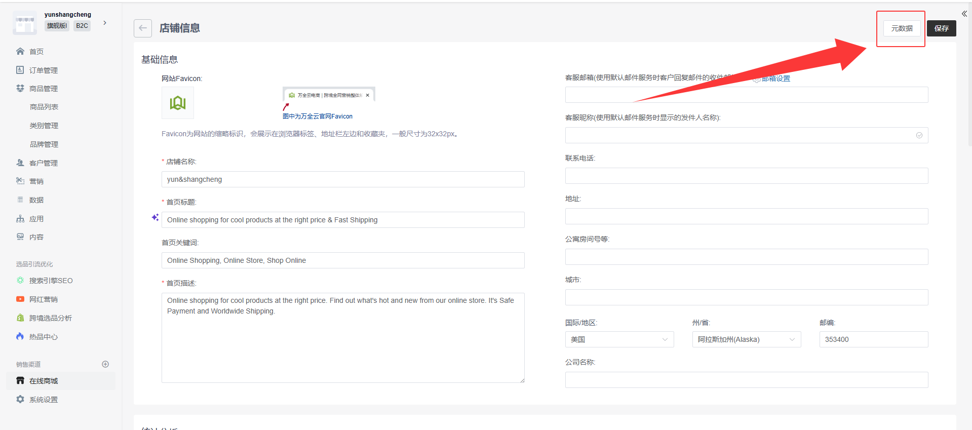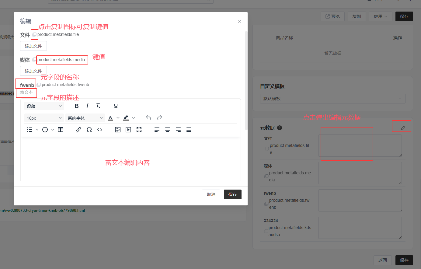点击在线商城->自定义页面->选择普通页面类型的自定义页面->元字段