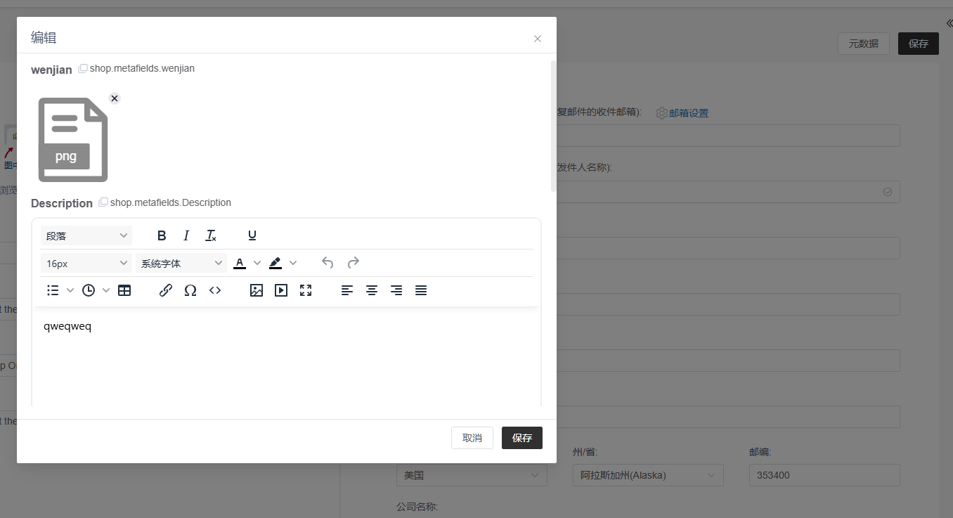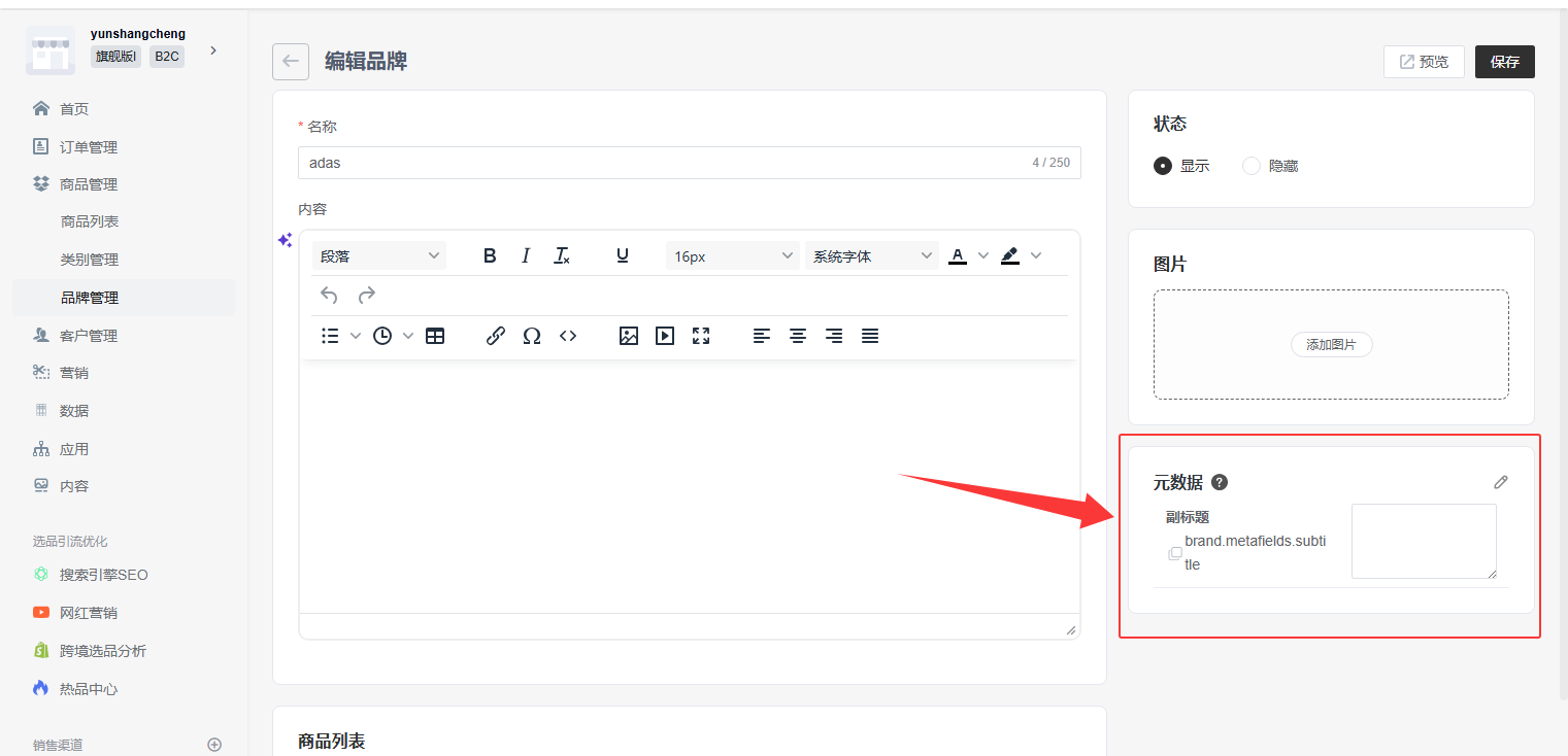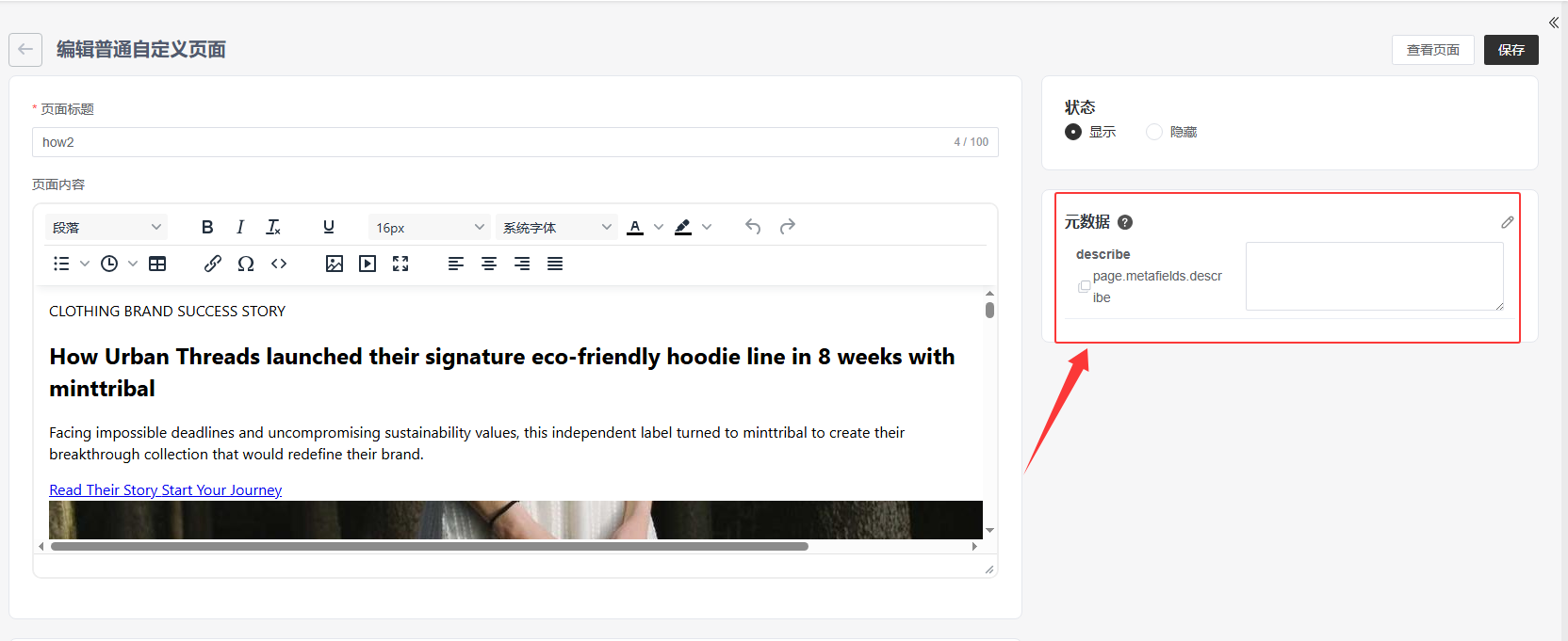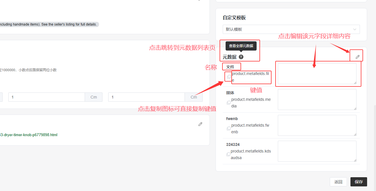 点击在线商城->自定义页面->选择普通页面类型的自定义页面->元字段