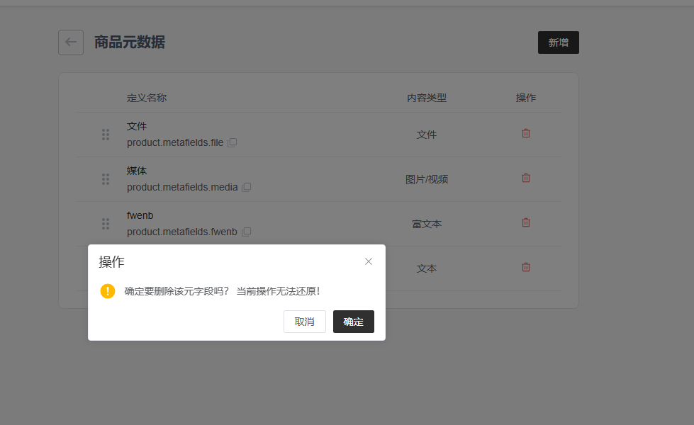 PS:删除元字段是一项永久性操作,无法还原,并且会把所有相关元数据清空,如在模板中添加了该字段内容显示,则前端显示为空。
