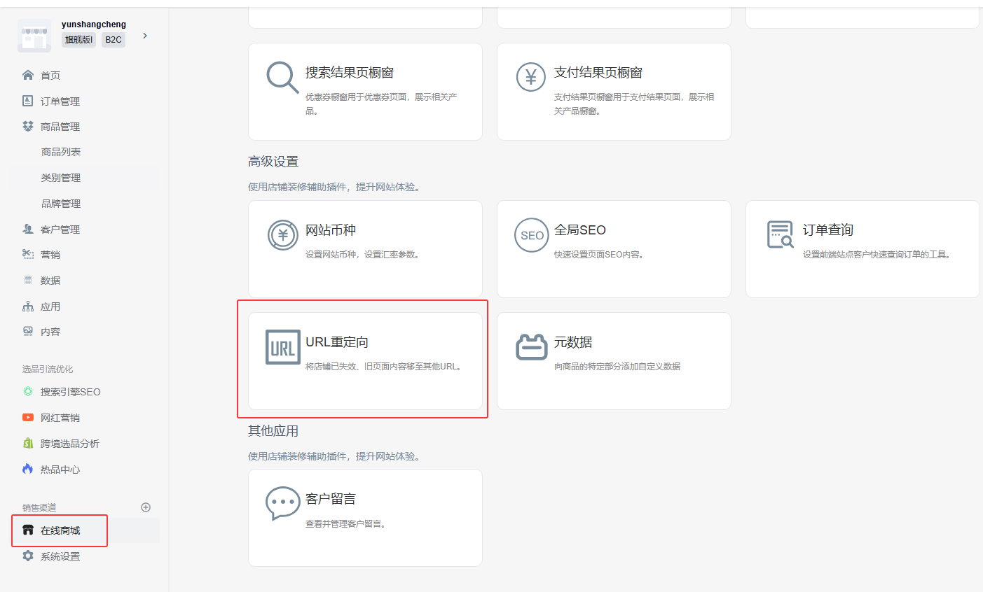 填写的URL是相对URL(例如:/all-products.html),如果重定向至填写的URL不是店铺已有的URL,将会显示“404”页面。