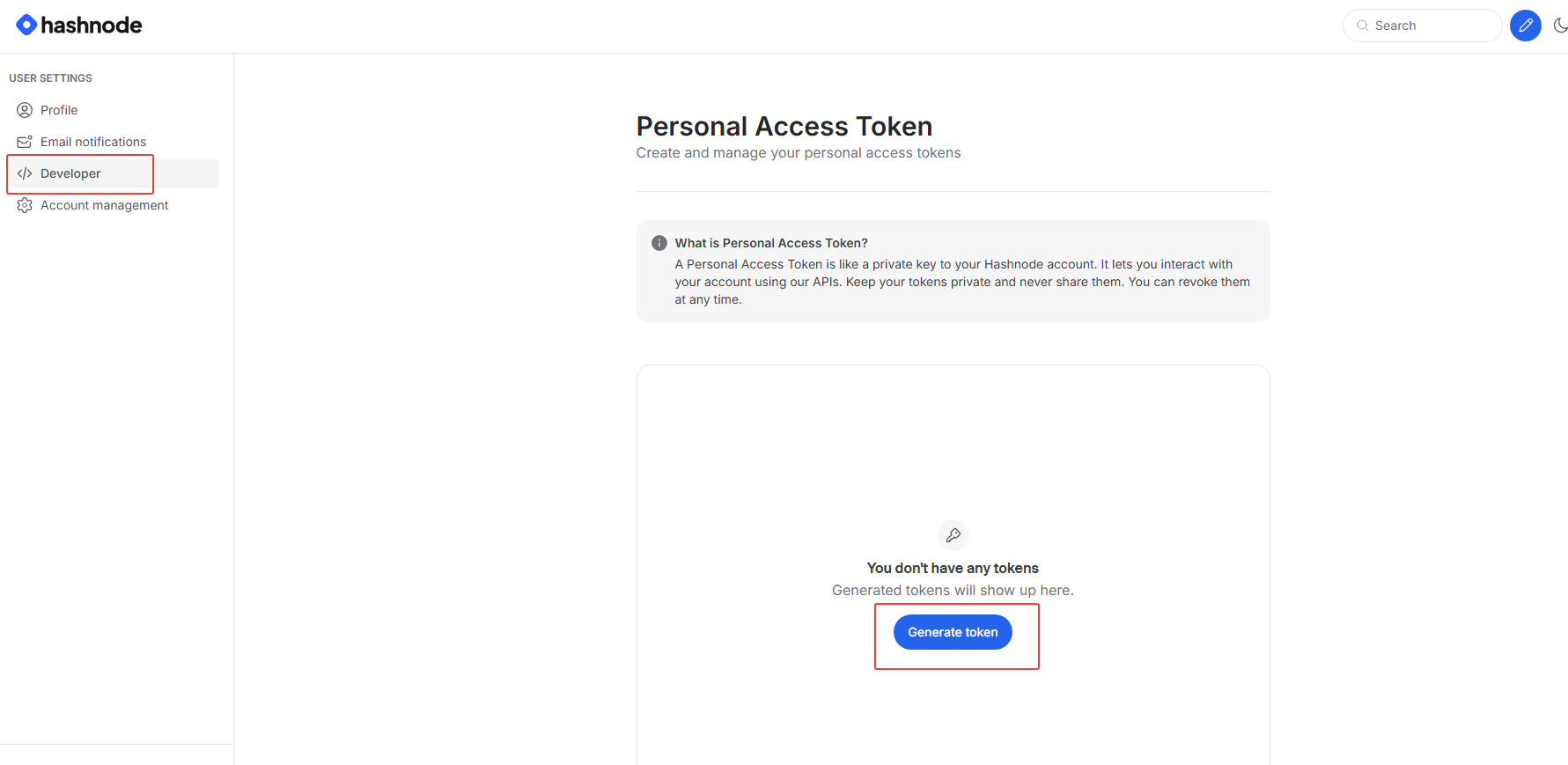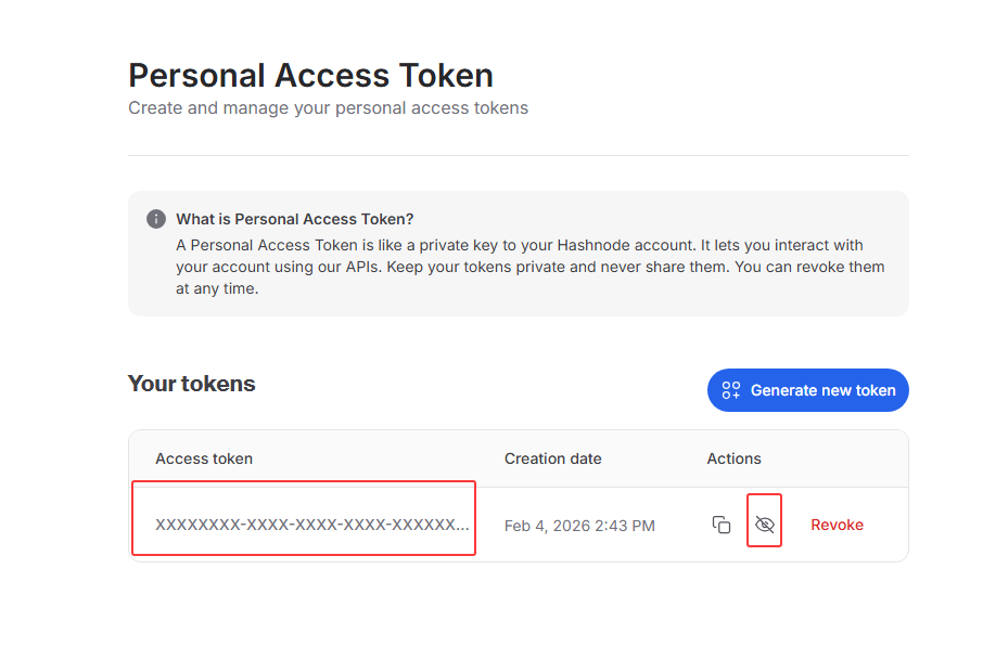 Hashnode 提供了一套可以自动发布博客的专属接口,不用手动在网页上编辑发布,只需先在 Hashnode 账号里生成一个专属的安全令牌(类似个人专属验证码),就能把写好的文章直接发布到你的 Hashnode 博客上。