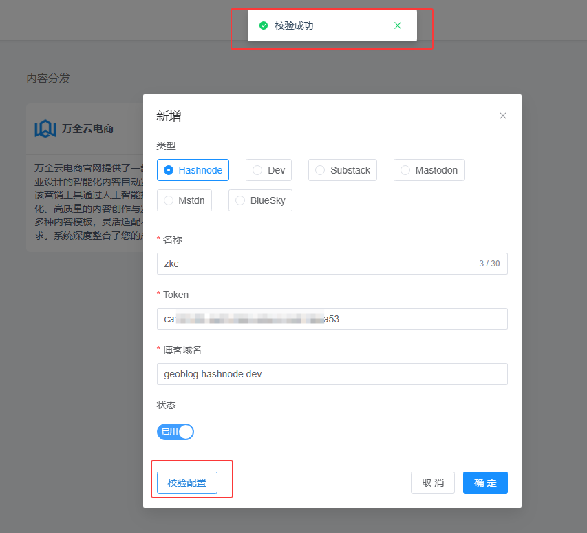 11、点击校验配置,显示校验成功说明所配置的token和域名是正确可使用的,最后点击确定